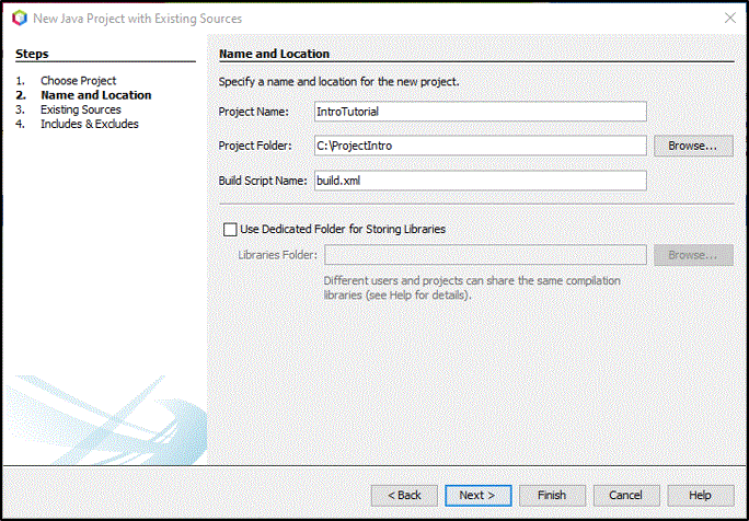 在 Name and Location(名称和位置) 面板中,在“项目名称”中指定项目的名称,在“Project Folder(项目文件夹)”中提供项目目录的位置,然后单击下一步。
