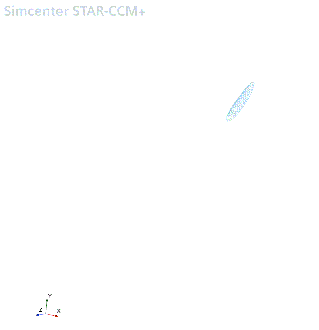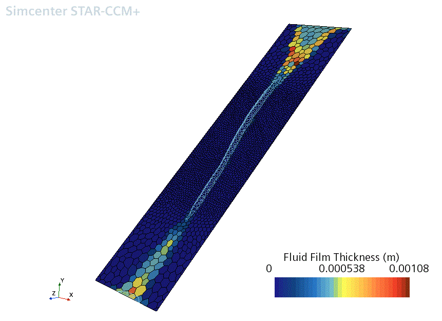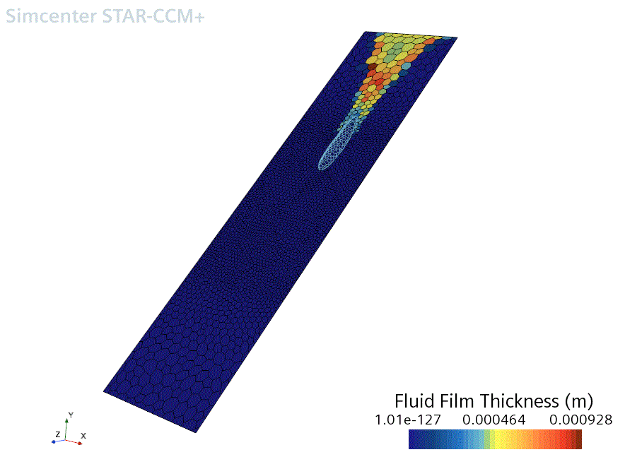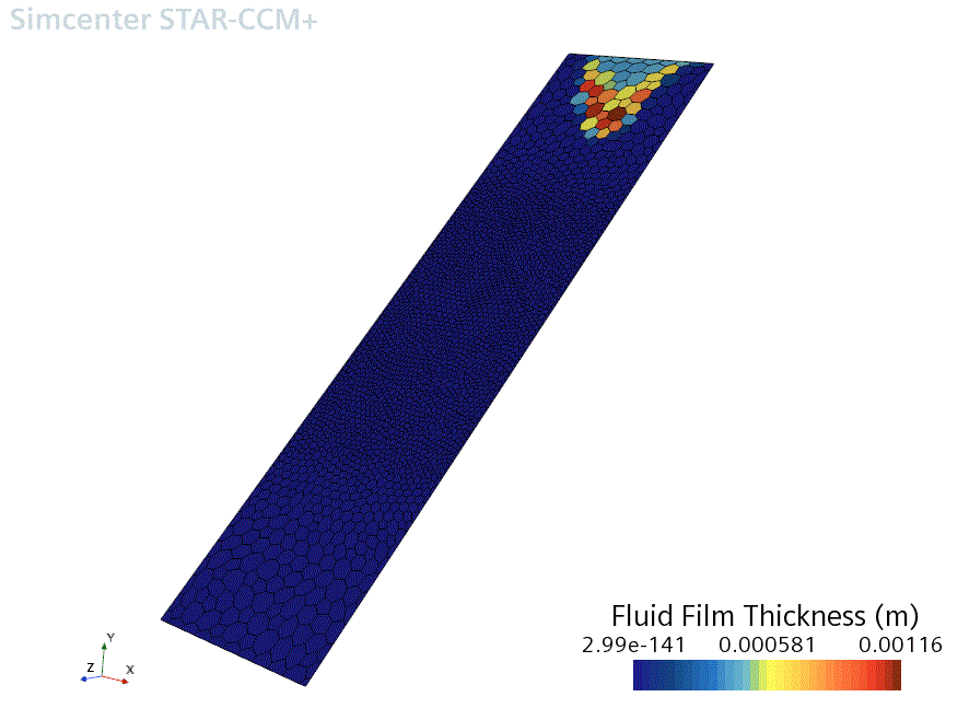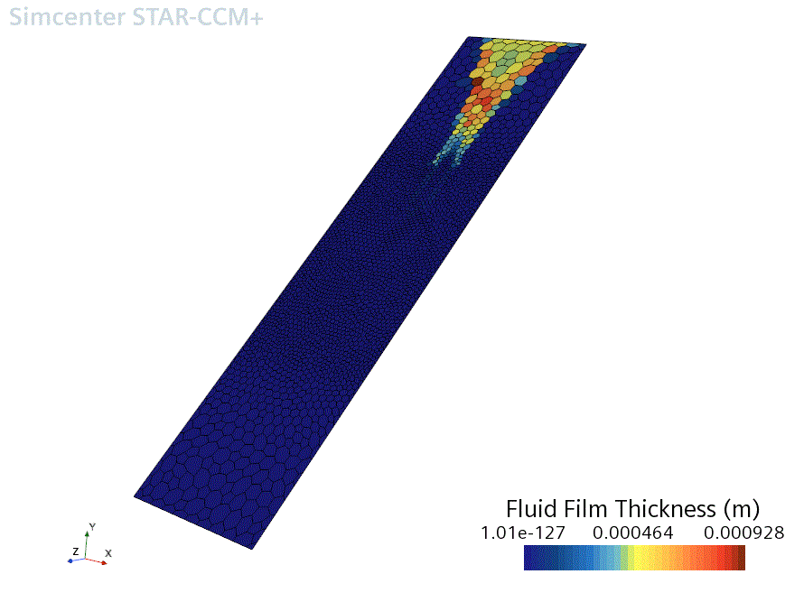 以下示例显示了模拟结束时的水流。当流量达到粗网格的下部区域时,水从 VOF 相模型转变为液膜模型。
