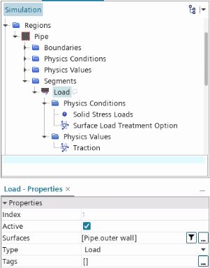 可以通过创建相应的段指定附加负载。如果在多个段中选择相同的零部件实体(零部件表面、曲线或点),Simcenter STAR-CCM+ 将自动计算该零部件实体上的总负载。