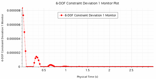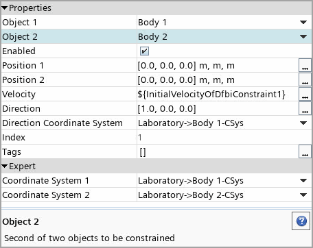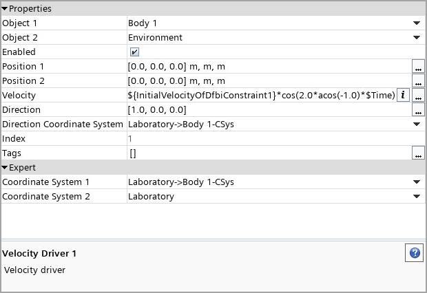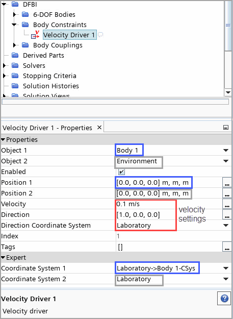 速度驱动器中指定的速度和方向必须与所有参与体的初速度和角速度一致。在本例中,在基准坐标系中将体的初速度设为 [0.1, 0, 0] m/s。要确保设置一致,可以使用 InitialVelocityOfDfbiConstraint 场函数。在速度驱动器的“速度”属性中使用此场函数。