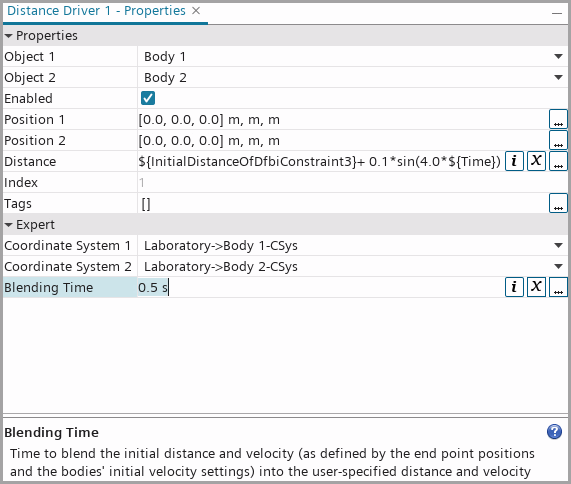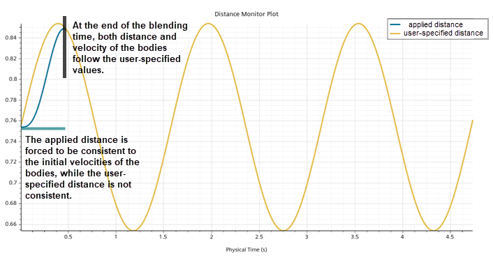 要解决此不一致状况,可以更改体的初速度和/或距离定义的时间相关性,这可能需要非常复杂的计算。在许多情况下,引入混合时间(例如 0.5s)非常方便,在它定义的时间窗中体初始条件自动混合到用户指定距离。在混合时间内,距离驱动所应用的距离将变为与体初始条件一致,并且在混合时间过后距离与用户定义距离匹配。