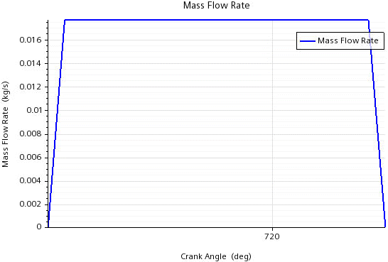 对于将燃料液滴喷射到发动机气缸中的情况,可以创建喷射器发动机零部件,它提供了用于定义喷射器几何和物理的模板。以表的形式指定燃料的质量流率,该表将质量流率定义为曲柄角度的函数。喷射燃料的初始温度为 310 K。