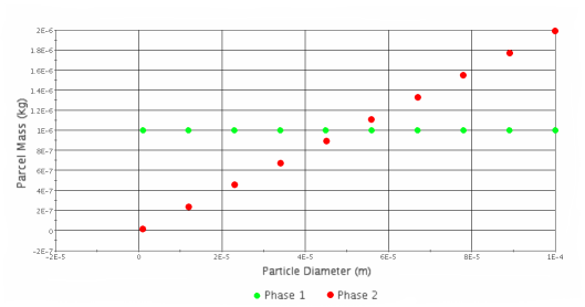 通过用户程序将每个粒子束中的质量作为直径函数进行更改很简单。 在此示例中,每个粒子束的质量流率随直径而线性增加。