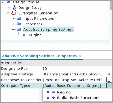 In this tutorial, you pre-select both possible surrogate types— Radial Basis Functions and Kriging. After the study run, the Adaptive Sampling study automatically generates each surrogate with the best fit surrogate type.