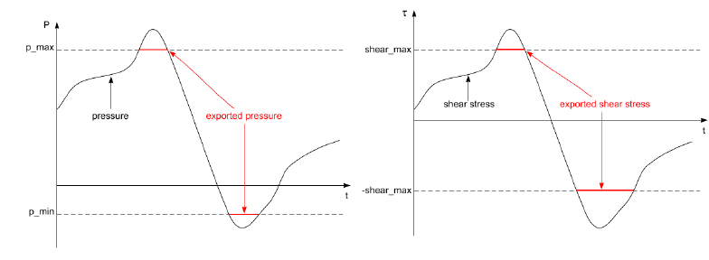 - 可用于限制流体域中的拉力负载,以反映实际操作条件。 拉力剪切参数指定为 [p_max, p_min, shear_max],其中,p_max 和 p_min 为已导出压力的最大值和最小值,shear_max 为最大剪切应力幅值。 这些值在整个协同仿真中保持恒定。 设置压力参数时,p_max 必须大于 p_min,这两个值可为负。 对于 shear_max,矢量方向保持相同,仅剪切幅值,如下所示。