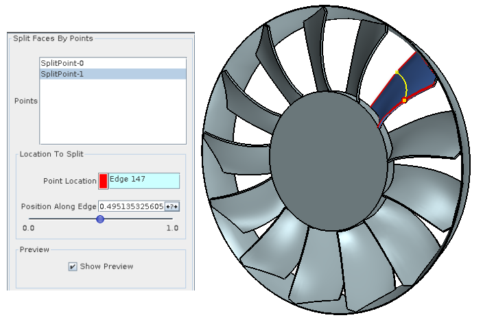 下图显示了叶片表面上的两个点及其在根据点分割面面板中的条目。