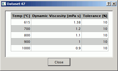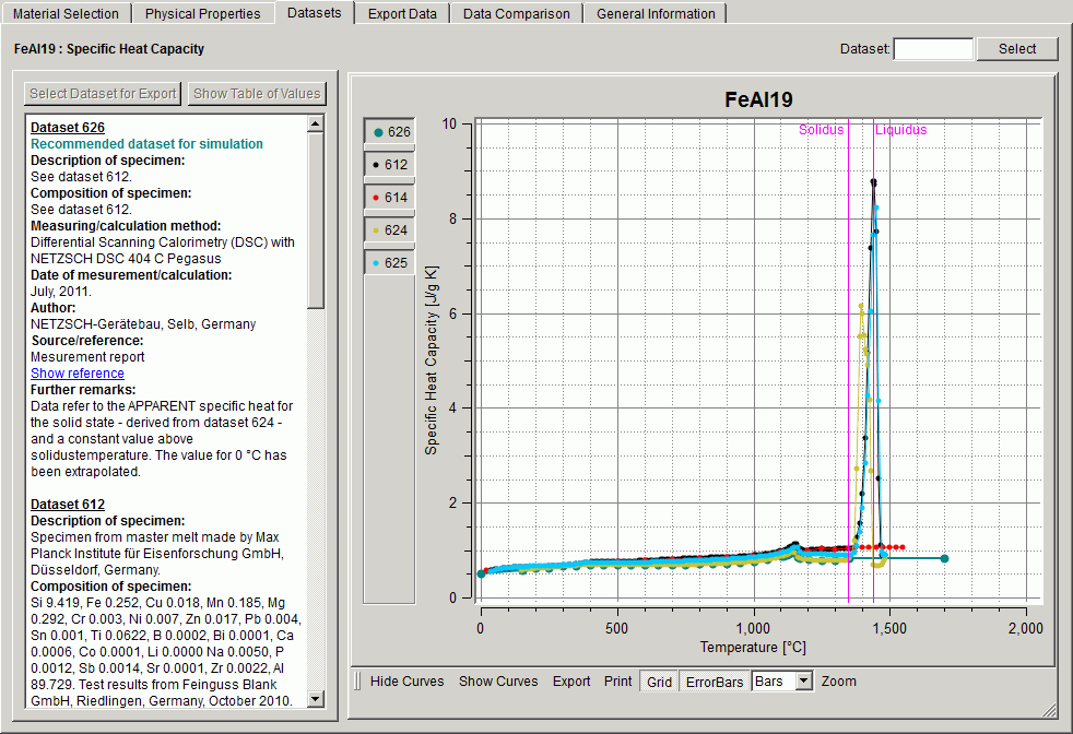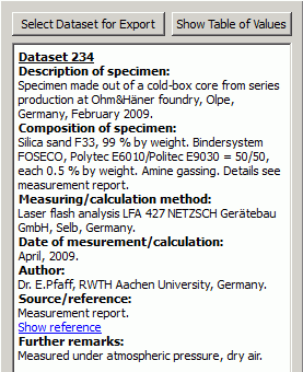 此时将显示 Datasets(数据集) 面板,其中显示与指定铸造材料和物理属性关联的所有数据集的详细信息。