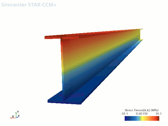 报告打印至输出窗口。顶凸缘角的计算应力大约为 17.4 MPa,这与 Euler-Bernoulli 梁理论提供的值 17.3 MPa 十分一致。