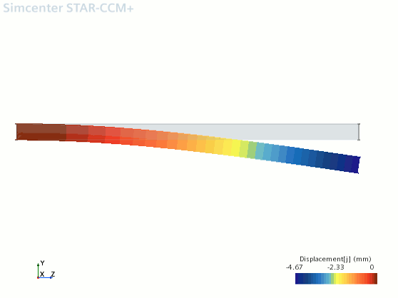 计算的最大位移约为 4.67 mm。Bernoulli-Euler 梁理论预测位移大约为 4.63 mm,因此数值解决方案与理论结果差值小于 1%。