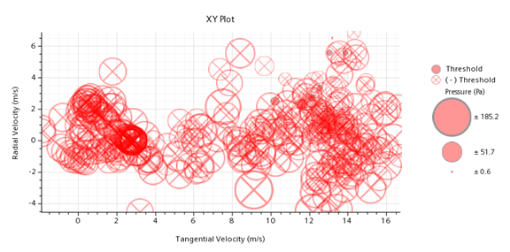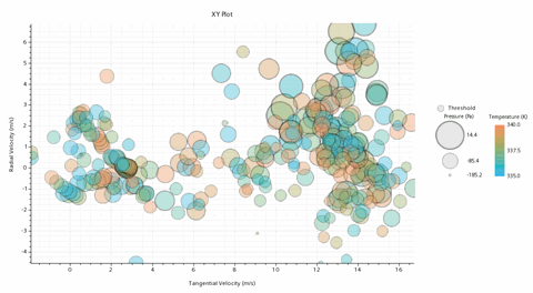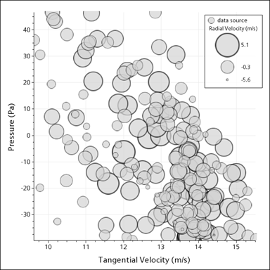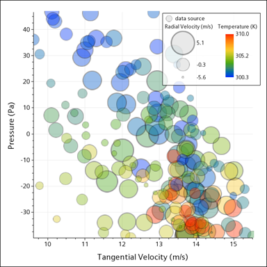使用气泡样式可向 XY 绘图添加另一个信息层。通过将气泡直径映射到标量场,可以获取一个信息层。通过将气泡颜色映射到标量场,可以获取另一个信息层。