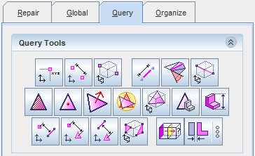 注 查询诊断也可用于区域修复,但输出不同。 例如,零部件和零部件表面列表将变为区域和边界列表。 - 在图形窗口中选择实体,然后单击相应的工具。 请参见查询工具参考。