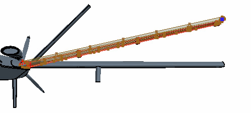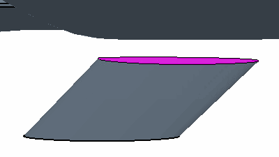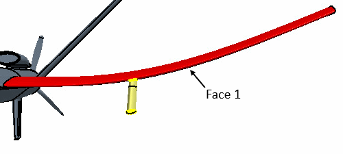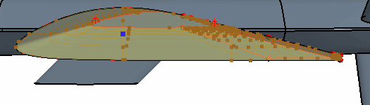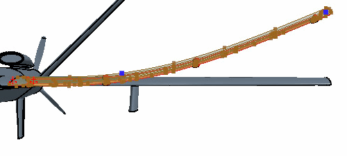 由于机翼表面的变形,硬点不再附着到机翼表面。要重新连接两个体,首先平移硬点,然后延伸硬点体,直到表面接触机翼表面。如果在平移硬点前执行扩展实体操作,硬点体将碰撞机翼尾缘控制表面。