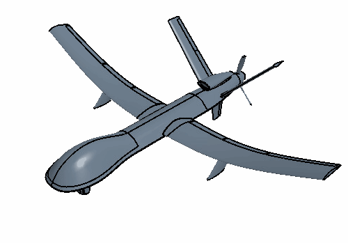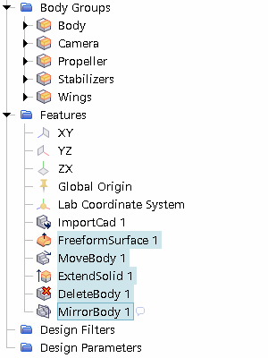 镜像体操作将对称线保持在 UAV 中心之下,这将最终保持飞机表现出来的物理行为。镜像体操作将生成源体的副本并沿飞机的对称线映射几何。如果在镜像体操作的上游更改了源体,则当更新流程时,这些更改将反映在镜像体中。 -