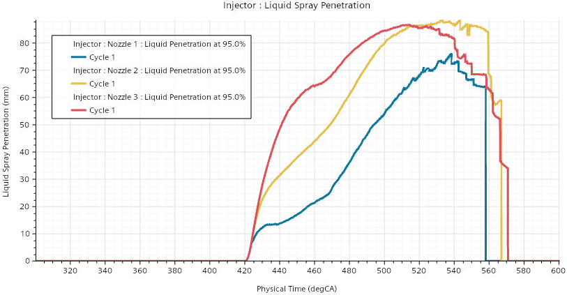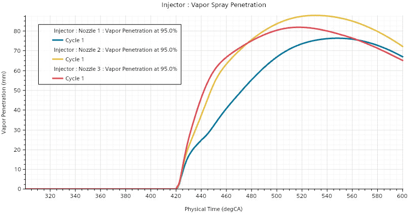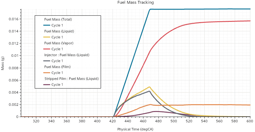 在模拟结束时,88.96% 的喷射燃料汽化,10.93% 在发动机壁上形成液膜。燃料的其余部分作为液滴提供。