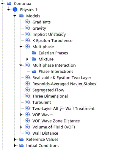 流体体积法会跟踪随时间推移水和空气之间的交界面。VOF 多相流模型采用高分辨率交界面捕捉 (HRIC) 格式提供网格单元面上体积分数的精确近似并改善交界面分辨率。要指定水位的初始位置,可使用 VOF 波模型定义平波。