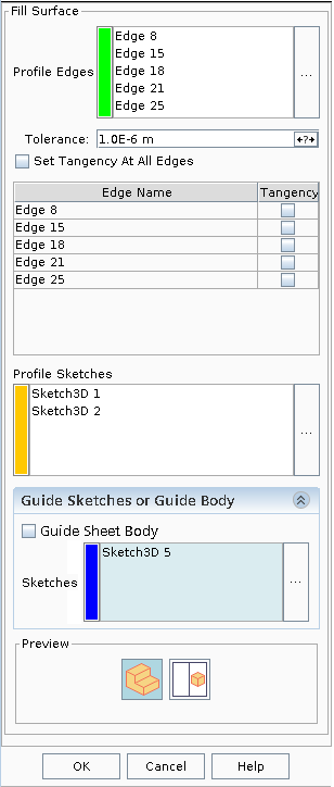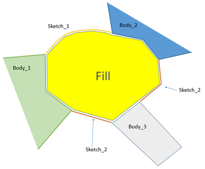 - 要跨越多个体填充表面,可将轮廓草图与轮廓边结合使用。这些草图和边必须形成一个闭合环。