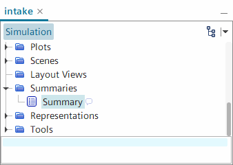 Within the Summaries node, you can create one or more summary objects from which you generate simulation object reports. You populate the summary objects with representations of simulation objects, and then move those representations around to achieve the layout you require.