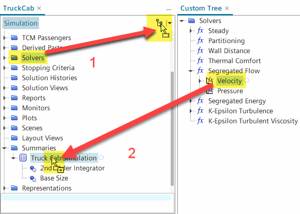 If you want to choose some objects from say, the Solvers node, you can first drag that node onto the Create Custom Tree button at the top-right of the object panel, and then drag objects from the custom tree back onto the summary node.