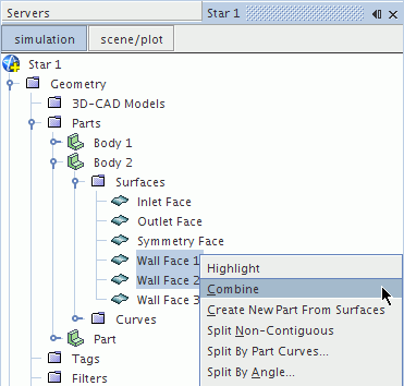 选择属于相同零部件的两个或更多个表面节点,右键单击并从弹出菜单中选择组合: