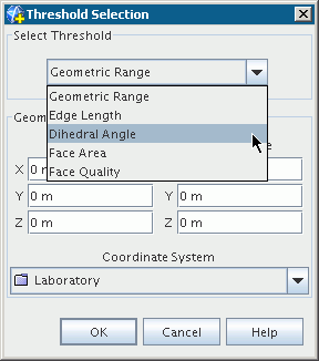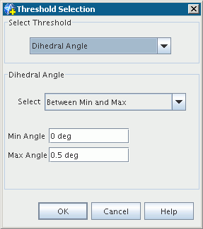 使用二面角阈值时,在阈值选择对话框中指定最小角度和最大角度。