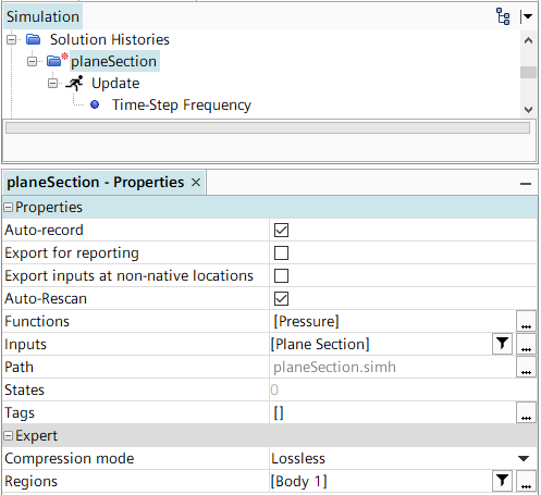 在衍生部件中创建一个平面截面,然后在求解历史下创建一个历史文件 (.simh),并将先前创建的平面截面用作输入部件。有关求解历史设置的示例,请参见下文。