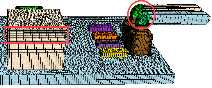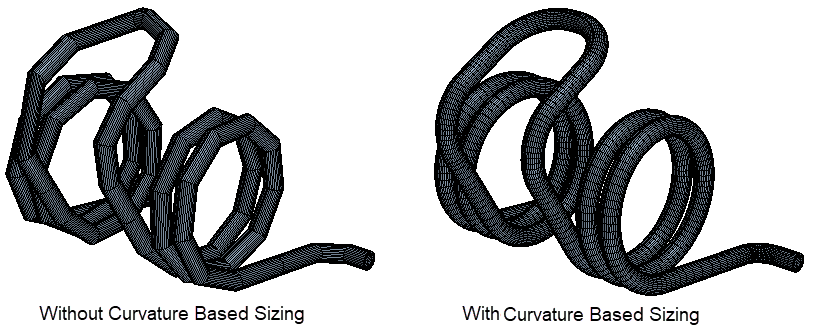在某些情况下,网格无法准确对几何的弯曲部分进行求解。要解决此问题,可以激活基于曲率的大小调整选项来增加弯曲截面中的网格单元层数。
