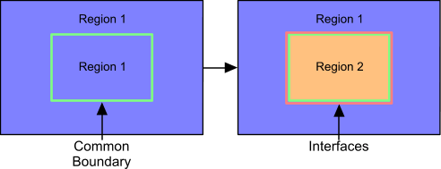 如果这些区域具有两个相邻边界,而非一个共享边界,则使用非连续分割并手动创建原位交界面。
