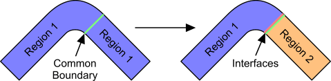 根据表面拓扑分割的操作会复制共享边界,以确保所有区域都为闭合状态。 分割操作还会在复制的边界之间创建原位交界面,以在区域之间创建共形网格。
