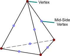 中间边节点可提高固体应力分析中 3D 单元的精度。有关将中间边节点添加到固体应力网格的说明,请参见生成 3D 有限元的网格。
