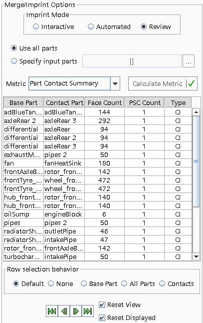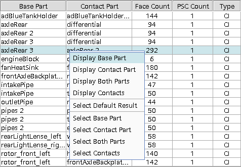 当在表中选择一行时,将在与当前度量的最佳默认结果对应的场景中自动执行选择操作。下面提供了每个接触的默认选择行为列表:度量 默认选择行为 部件接触汇总 选择部件接触的所有接触面 接触部件数 选择基本部件以及与基本部件接触的所有部件 部件接触面积比 选择基本部件的部件接触面 接触面积不匹配 选择部件表面接触的面 非连续接触 选择部件表面接触的面 非接触孤岛 选择部件表面接触的面 接触拓扑错误 选择对应于每个部件表面接触的拓扑错误的面和边 如果要使用其他选择行为,使用行选择行为选项更改结果场景选择。有关这些选项的详细信息,请参见查看压印模式选项。