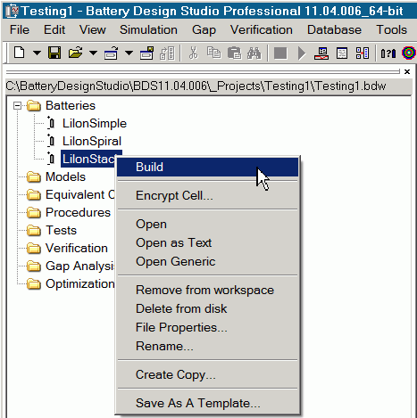 在电池节点下,右键单击要构建的电池,然后选择 Build(构建)。