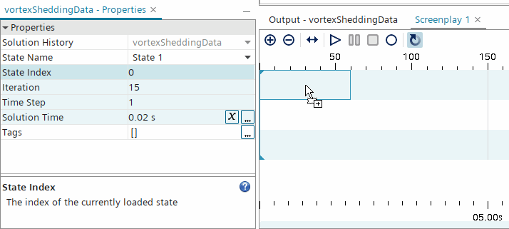 对于每个求解视图节点,将合适的帧控制属性拖到动画剧本编辑器面板中。可以从状态索引、迭代、时间步或求解时间中选择。