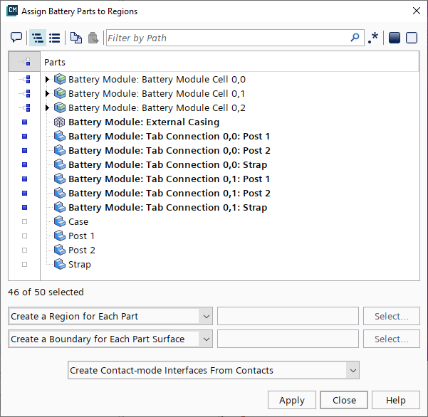 Simcenter STAR-CCM+ 将自动创建电池模块的区域和交界面。