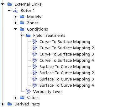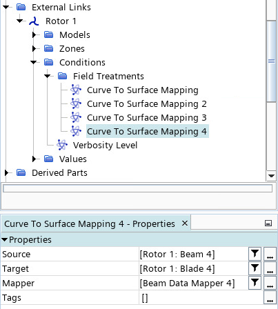 同样,创建叶片 2、3 和 4 的曲线到表面映射,并指定相应的区域,例如曲线到表面映射 2 从转子 1: 梁 2 映射到转子 1: 叶片 2(使用梁数据映射器 2)。