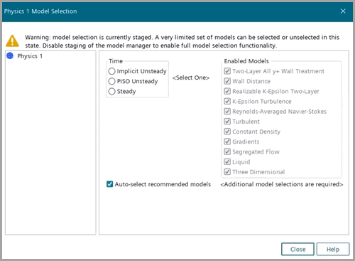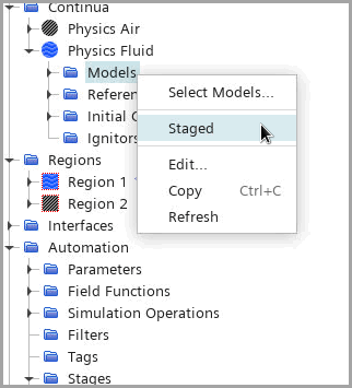 For physics models, Simcenter STAR-CCM+ currently only supports the Time model. That is, you can only set different Time models for different stages within the physics models. All other models must stay the same in all the stages: