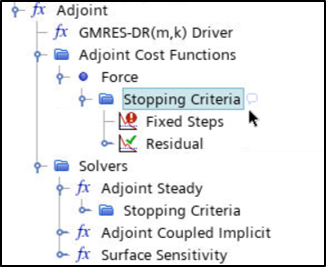 默认情况下,伴随求解器没有全局停止标准。相反,创建成本函数时会有两个自动生成的停止标准。这些成本函数特定的停止标准为固定步数和残差。