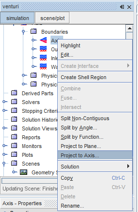 指定入口处 X 方向的恒定速度和出口处的恒定压力。将中心线边界设为轴类型。此轴边界必须精确位于 Y = 0 线上;将轴映射至适当平面。