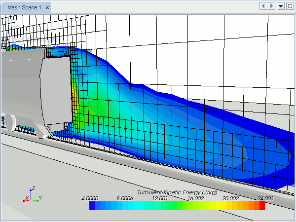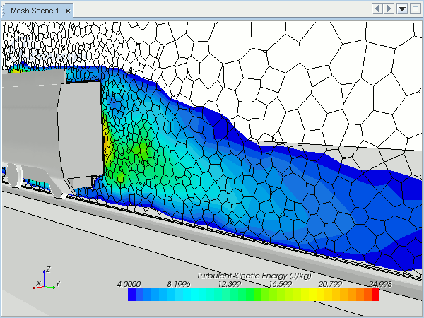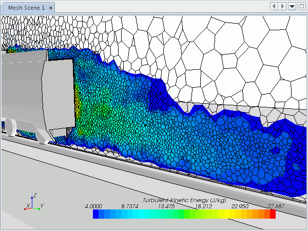 The following examples show mesh refinement using the trimmed, polyhedral, and tetrahedral mesher. The field function refines the mesh in an area where the turbulence kinetic energy is greater than 4.0 J/kg: