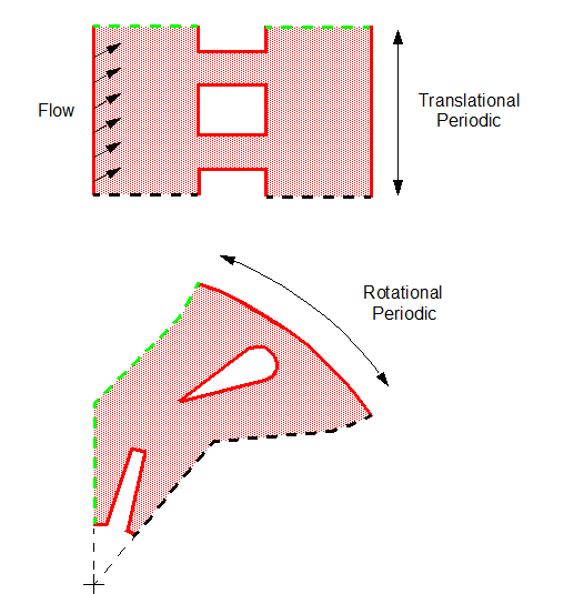 要定义周期交界面,可将一个边界的周长设为与周期匹配边界的转换后的周长重合。下图显示应用于以平移和旋转方式重复的几何的周期交界面的示例。每种情况中的绿色虚线和黑色虚线表示周期交界面边界对的位置。对于每个边界对,边界的形状和大小匹配,它们由给定的矢量或角度分开。Simcenter STAR-CCM+ 将自动计算平移矢量或旋转角度,它们是交界面周期转换节点的属性。