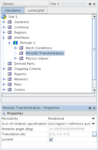 - 可以选择指定轴,以使用轴子节点为此交界面定义唯一轴,否则改用使用区域基准轴线。对于后一个选项,可在节点中定义轴属性。将周期交界面应用于两个分开区域中的边界时,将使用主边界(边界-0)的区域轴。