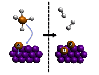 例如,在下图中,气体分子被吸附在先前吸附的表面组分旁边的表面上。气体分子分解为其构成原子。吸附的某些原子发生反应,形成离开表面的小气体分子。气体分子中的一个原子仍然作为表面组分被吸附,而先前吸附的表面组分则成为块体组分。