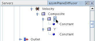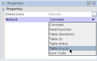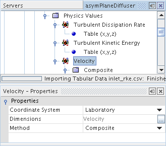 在此示例中,速度指定边界条件已设为组分,因为在表文件仅使用了 X 分量。 因此,对于此节点,方法属性必须设为复合以使用复合矢量分布法。
