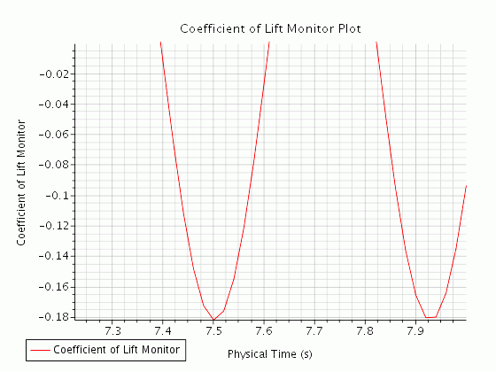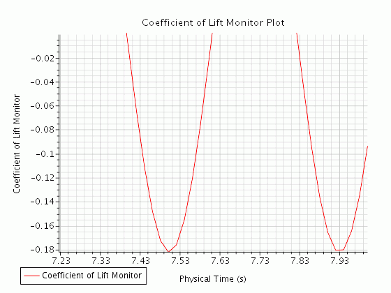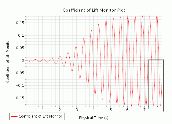其中 是涡流脱落频率, 是圆柱体直径, 是自由流速度。在本例中,使用由 Daily et al.[413] 定义的斯特罗哈数 0.15。因此,计算的涡流脱落的理论频率是 2.25 Hz,其周期为 0.444 秒。