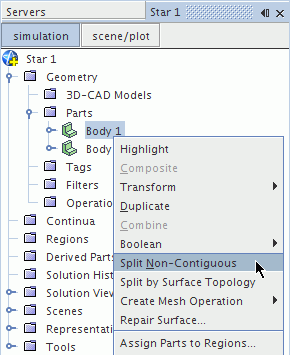 右键单击零部件节点并从弹出菜单中选择根据非连续分割: