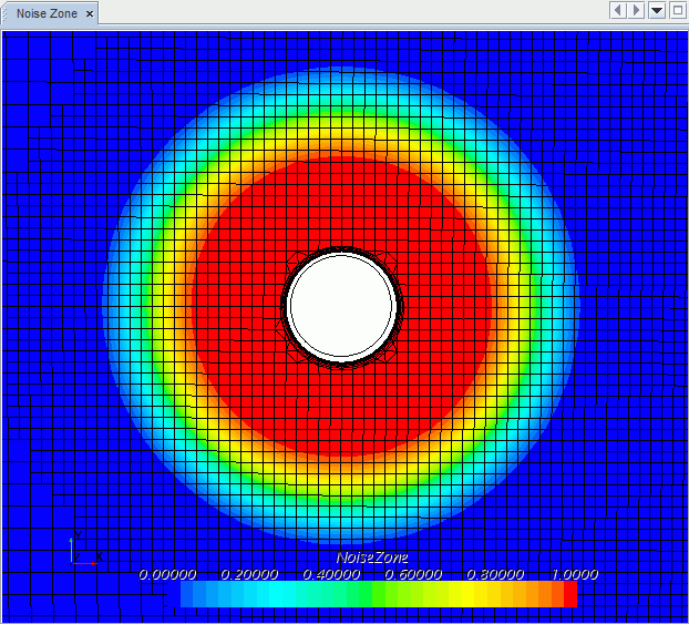 噪声源是围绕圆柱体的区域。在此示例中,有一个从左到右的强大气流,通过来自圆柱体的涡流脱落生成声波。请注意整个噪声源区的精细网格。
