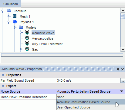 在物理连续体中,选择声波模型,并将噪声源属性设为基于声扰动的源。