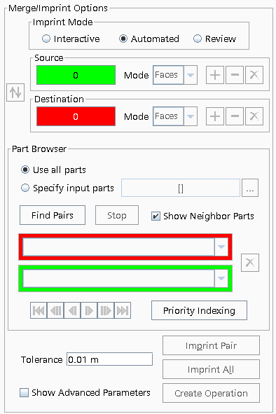 每个部件对都会在图形窗口中以绿色和红色显示,分别表示源表面和目标表面。对于当前的表面准备会话,先前压印的对会保留在浏览器中,但处于非活动状态(即不会以绿色或红色显示)。