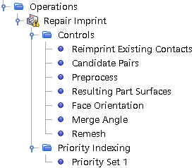 重印现有接触和压印后网格重构等控制选项不显示在表面修补中,因此针对新创建的压印操作设为默认状态。可以在树中更改这些选项。所有其他选项直接从表面修补转移到该操作中,包括用于容差和合并角的单位。