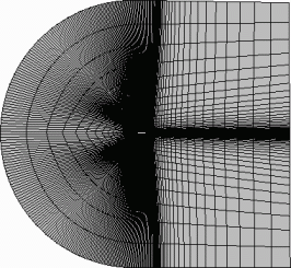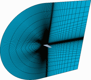 下面的三维六面体网格可模拟连接到对称平面的机翼上的流体。