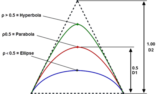 The conic section option enables you to create fillets driven by the Rho value. Rho is a ratio that defines the curvature of the shape. The three types of conic sections are parabola, ellipse and hyperbola (see the diagram below).